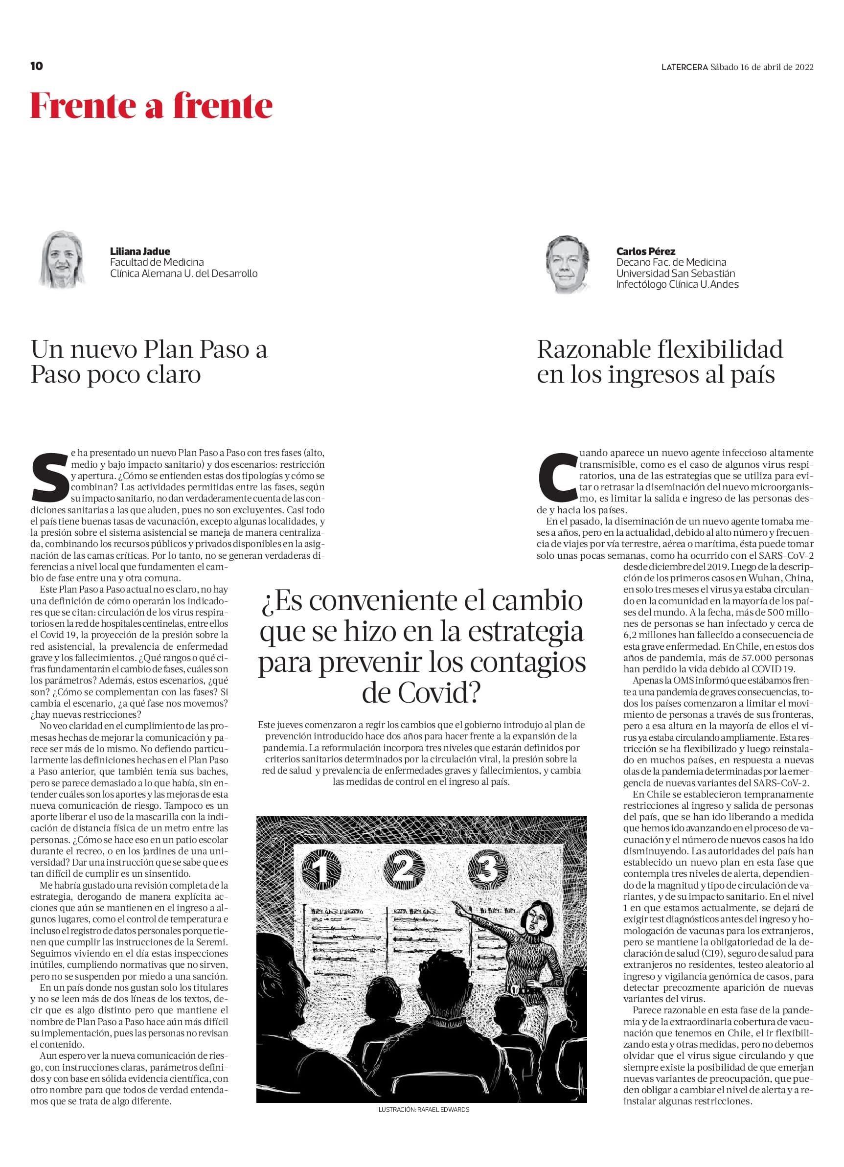 Por su parte, el decano de la Facultad de Medicina y Ciencia de la U. San Sebastián, Carlos Pérez, valoró la flexibilización de los controles en el aeropuerto. "Las autoridades del país han establecido un nuevo plan en esta fase que contempla tres niveles de alerta, dependiendo de la magnitud y tipo de circulación de variantes, y de su impacto sanitario. En el nivel 1 en que estamos actualmente, se dejará de exigir test diagnósticos antes del ingreso y homologación de vacunas para los extranjeros, pero se mantiene la obligatoriedad de la declaración de salud (C19), seguro de salud para extranjeros no residentes, testeo aleatorio al ingreso y vigilancia genómica de casos, para detectar precozmente aparición de nuevas variantes del virus. Parece razonable en esta fase de la pandemia y de la extraordinaria cobertura de vacunación que tenemos en Chile, el ir flexibilizando esta y otras medidas, pero no debemos olvidar que el virus sigue circulando y que siempre existe la posibilidad de que emerjan nuevas variantes de preocupación, que pueden obligar a cambiar el nivel de alerta y a reinstalar algunas restricciones", afirmó.