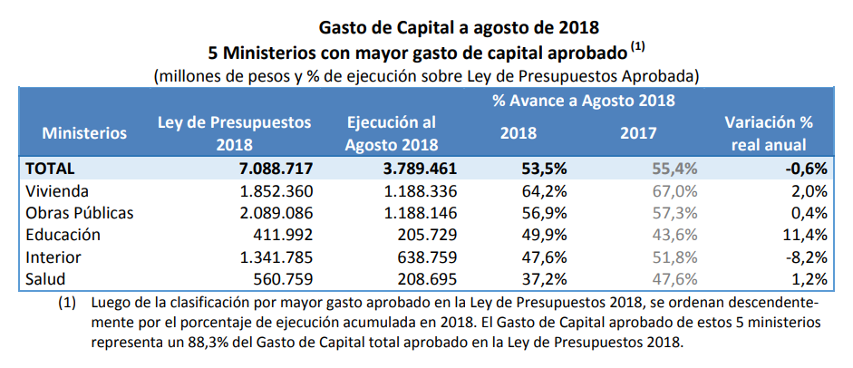 Detalla la Dipres que “en relación a la tasa de ejecución del Gasto de Capital, se destacan los Ministerios de Vivienda, Obras Públicas y Educación con porcentajes ejecutados acumulados al mes de agosto por sobre el 50%, mientras que Interior y Salud registran un relativo rezago como consecuencia de la incorporación de nuevos proyectos de inversión cuya ejecución se concentrará en el segundo semestre del año, según lo ya señalado en informes anteriores”.