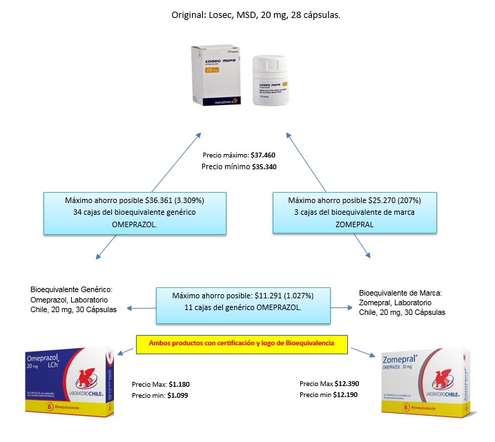 El medicamento que registró mayores diferencias fue el relacionado al principio activo Omeprazol de 20 mg, destinado al tratamiento de úlceras gástricas, cuyos valores fluctúan entre los $1.099, el bioequivalente genérico del laboratorio Chile; $12.390 el Zomepral, bioequivalente de marca también del Laboratorio Chile, y $37.460 el Losec (original). Es decir, un consumidor se puede ahorrar hasta $36.361 y puede comprar hasta 34 cajas del más económico, por sólo una del medicamento de mayor valor. Al comparar los valores entre los bioequivalentes (genérico y de marca), se comprobó que el máximo ahorro es de $11.291 y se pueden comprar hasta 11 cajas de un genérico por uno de marca.