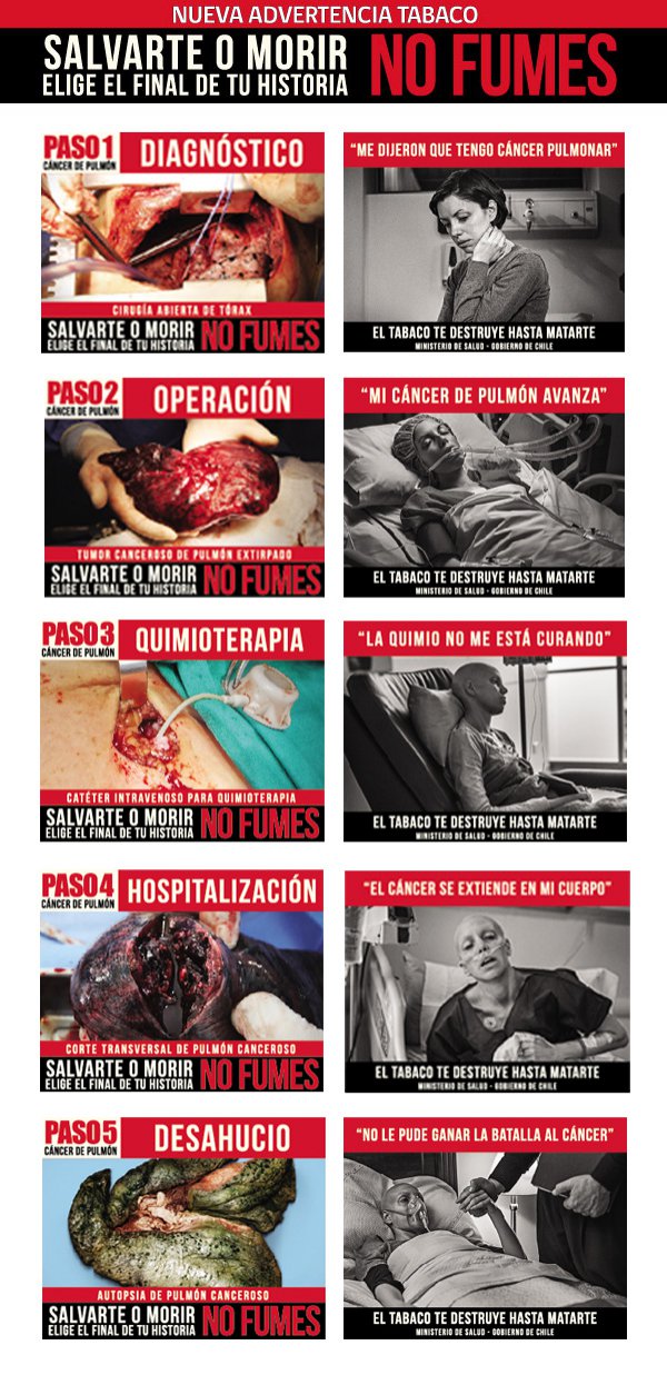 Según señala el informe de la Sociedad Canadiense del Cáncer los países están optando por mensajes sanitarios con fotografías en los productos elaborados con tabaco, como en el caso de Tailandia, donde la advertencia representa un 85% del envase. En Chile, el aviso ocupa el 50% de la superficie de la cajetilla, ubicándonos en el lugar 33 del ranking internacional.